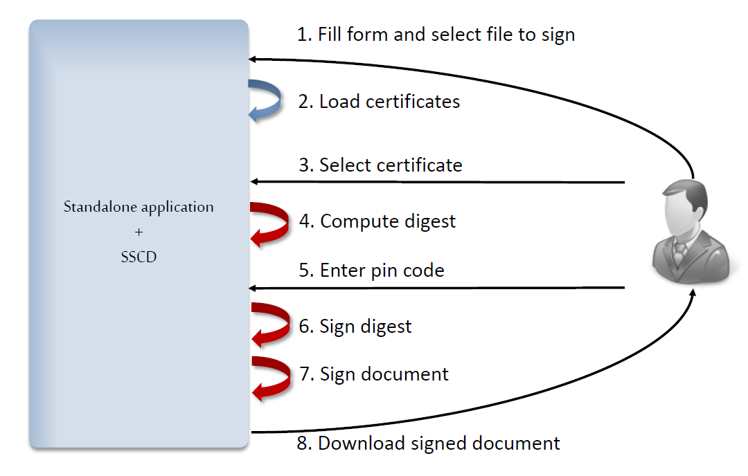 All DSS business logic is embedded inside this application (CAdES, PAdES, XAdES, ASiC). This application doesn't require a DSS server.